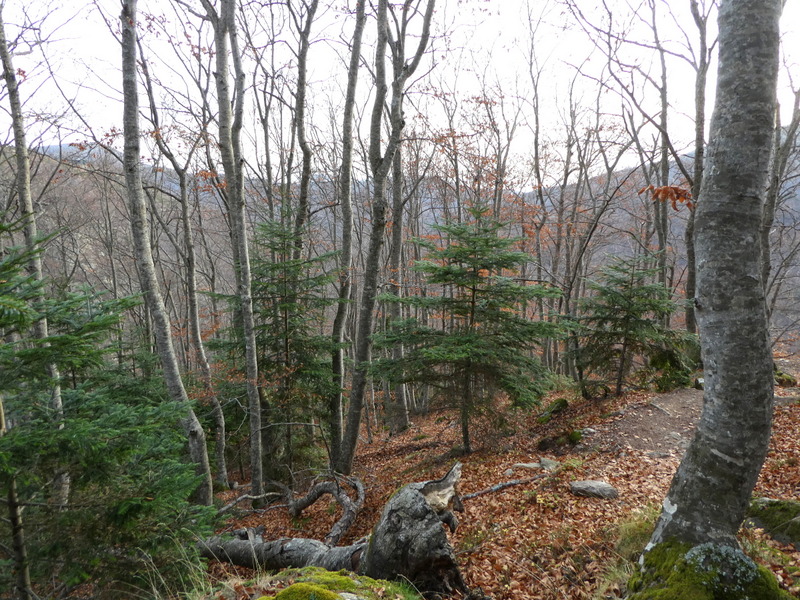 A propos de végétation ce sentier est intéressant car il permet un panorama de la végétation de montagne, ses différents étages, mais aussi selon l'exposition géographique. Pour des amoureux de botanique, géographie et histoire, il y a de la lecture ! On ne s'y ennuie pas en plus de faire travailler souffle et muscles. Une difficulté s'ajoute à cette montée ardue : le tapis de feuilles de hêtres est un vrai enfer. On croirait marcher sur des billes ou sur une plaque savonnée. Ce sera le pire élément de la montée et de la descente en perspective. je songe déjà au retour par le Pinateil, sur le versant opposé.