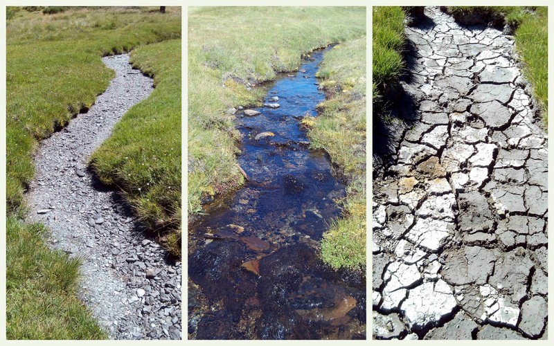 A présent je vais descendre par le sentier, ce sera long, mais la partie (3 km), avant de retrouver la piste, est magnifique : petites gorges, cascades discrètes, fleurs, éboulis, relief tourmenté au plus près de l'eau, dans un désert minéral à l'herbe rase.